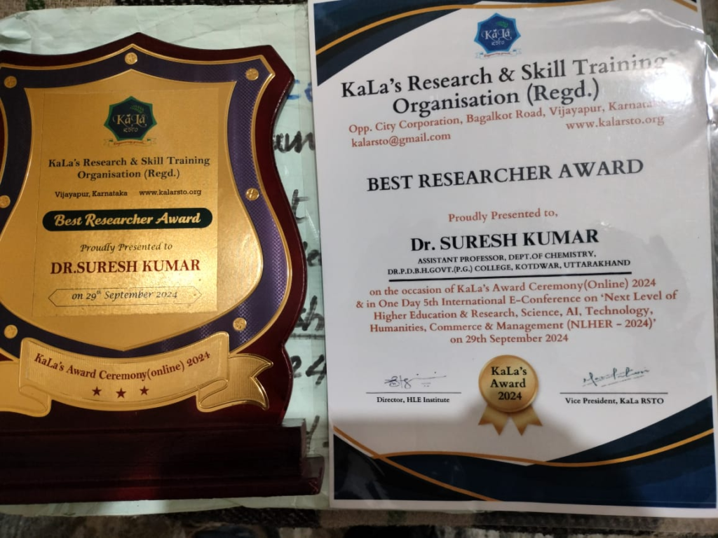 डाॅ0 कुमार को यह अतिप्रतिष्ठित पुरस्कार इस इंटरनेशनल ई-काॅफ्रेंस में देश-विदेश के प्रतिभाग करने वाले साइंटिस्टों, शिक्षाविदों, विषय विषेषज्ञों जैसे टी.एस. डाॅ0 नोरमाला एस गोविंदाराजो (हेल्प विश्वविद्यालय मलेशिया), डाॅ0 रवीन्द्रनाथ पंडित (उपरजिस्ट्रार केन्द्रीय विश्वविद्यालय कर्नाटक, गुलबर्गा) एवं डाॅ0 शौगन्द अकबेरियन (विश्व प्रसिद्ध अंग्रेजी शिक्षाविद्)आदि की गरीमामयी उपस्थिति में आनलाईन दिया गया। डाॅ0 सुरेश कुमार वर्तमान में डाॅ0 पीताम्बर दत्त बर्थवाल हिमालयन राजकीय स्नातकोत्तर महाविद्यालय कोटद्वार पौड़ी गढवाल उत्तराखण्ड के रसायन विज्ञान विभाग में वरिष्ठ सहायक प्रोफेसर के पद पर कार्यरत हैं। इस पुरस्कार में मिलने वाली ट्राॅफी व प्रशस्ति पत्र को आज दिनांक 31.12.2024 को प्राचार्य प्रोफेसर (डाॅ0) डी. एस नेगी के हाथों से डाॅ0 सुरेश कुमार को महाविद्यालय में प्रदान किया गया। डाॅ0 सुरेश कुमार इस से पूर्व में भी कई बार रसायन विज्ञान क्षेत्र में किए गए उत्कृष्ट शोध कार्यों एवं उच्च षिक्षा के क्षेत्र में किए गए विषेष योगदान के लिए कई प्रतिष्ठित पुरस्कारों से सम्मानित हो चुके हैं और अपने उत्तराखंड प्रदेश का नाम देश विदेश में रोशन कर चुके हैं।