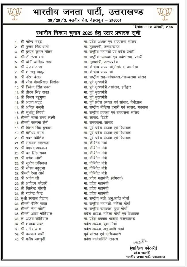 Uttarakhand News : देहरादून। उत्तराखंड में निकाय चुनावों प्रचार अभियान को गर्माने के लिए भारतीय जनता पार्टी के दिग्गज नेताओं के मकर सक्रांति के बाद मैदान में उतरेने की संभावना है। पार्टी ने ऐसे 40 स्टार प्रचारकों की लिस्ट जारी कर दी है। स्टार प्रचारकों में उत्तराखंड के मुख्यमंत्री पुष्कर सिंह धामी के अलावा उत्तर प्रदेश के सीएम योगी आदित्यनाथ का नाम भी शामिल है। इसके अलावा लोकसभा व राज्यसभा के सांसद, सूबे के कैबिनेट मंत्री और पार्टी संगठन से जुड़े नाम भी स्टार प्रचारक बनाए गए हैं।