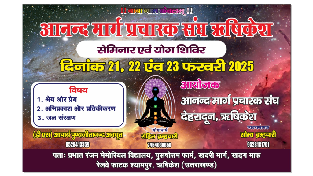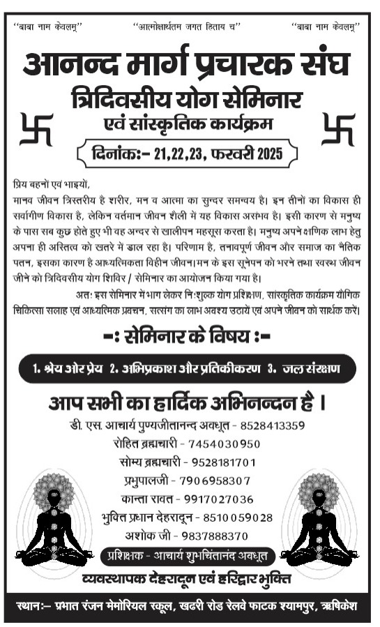 दरअसल, आनंद मार्ग प्रचारक संघ ऋषिकेश के श्यामपुर खदरी रोड स्थित प्रभात मेमोरियल स्कूल के प्रांगन में त्रिदिवसिय योग ध्यान पर आधारित अध्यात्म व समाजिक विषय पर सेमिनार जिला देहरादून में शुरू हो गया है। इस अवसर पर वाराणसी हरिद्वार,मेरठ व देहरादून के अलावे अन्य जनपदों से वरिष्ठ अवधूत,वरिष्ठआचार्य,तात्विक एवं वरिष्ठ साधक के साथ महिला