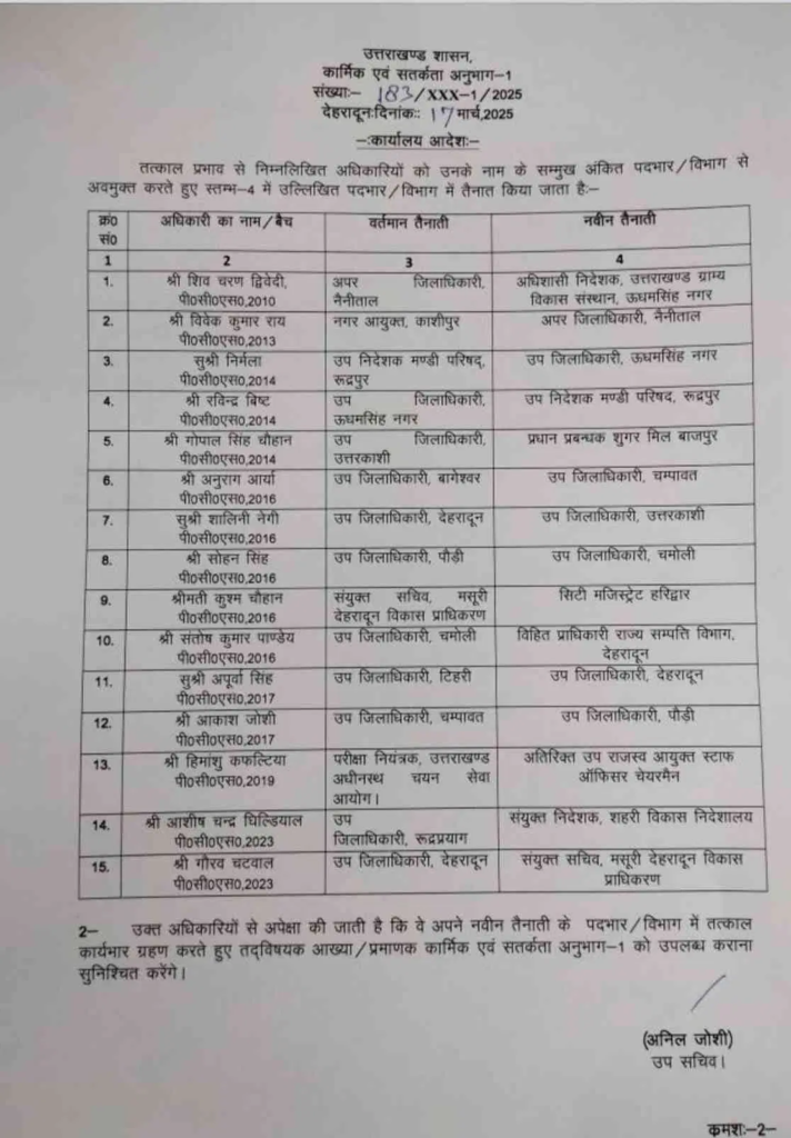 Uttarakhand में 15 PCS अफसरों के तबादले|Click कर पढ़िये पूरी News