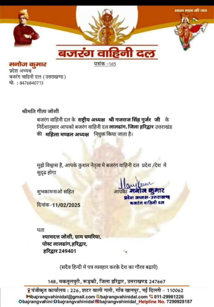 बजरंग वाहिनी दल की ओर से इस बाबत श्रीमती गीता जोशी को आधिकारिक पत्र भी सौंपा गया है।
