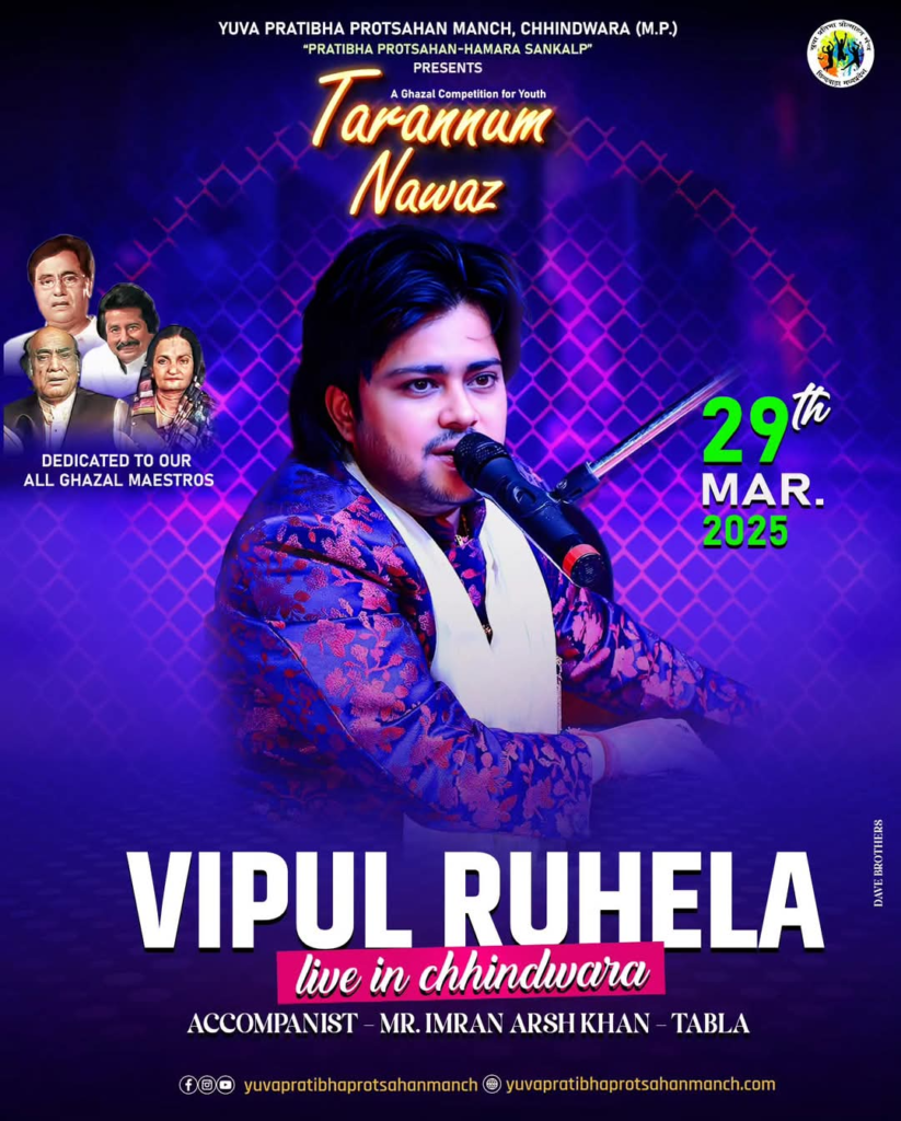 हरिद्वार। धर्मनगरी हरिद्वार तथा देवभूमि उत्तराखंड के प्रसिद्ध शास्त्रीय व सुगम संगीत गायक विपुल रुहेला की ग़ज़लों का जादू आगामी 29 मार्च 2025 को छिंदवाड़ा (म.प्र.) में आयोजित होने वाले अखिल भारतीय ग़ज़ल गायन प्रतियोगिता ‘कौन बनेगा तरन्नुम नवाज़’ के ग्रैंड फिनाले में भी छाएगा। कार्यक्रम का आयोजन ‘युवा प्रतिभा प्रोत्साहन मंच’ की ओर से किया जा रहा है l