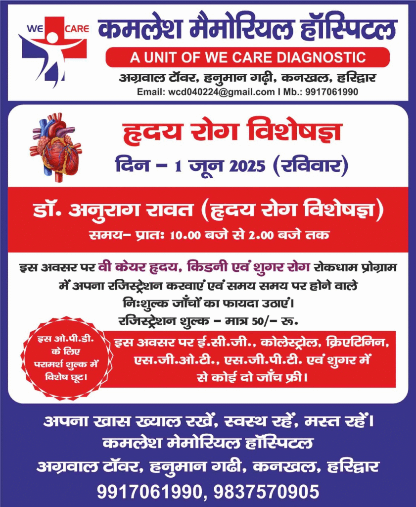 अस्पताल प्रबंधन की ओर से जारी मीडिया जानकारी में यह जानकारी देते हुये बताया गया है कि हृदय रोग विशेषज्ञ डा अनुराग रावत मरीजों का परीक्षण करेंगे। रजिस्ट्रेशन शुल्क 50 रूपये है। कमलेश मेमोरियाल हाॅस्पिटल, अ्रग्रवाल टाॅवर हनुमान गढ़ी, कनखल, हरिद्वार से उक्त कैंप के बाबत अधिकारी जानकारी प्राप्त करने के लिये 9917061990 और 9837570905 नंबरों पर संपर्क किया जा सकता है।