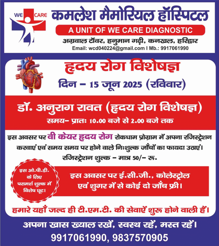 मौजूदा समय में बदलती और आधुनिक होती जीवन शैली के चलते दिल का विशेष ख्याल रखने की जरूरत है। ऐसे में यह जरूरी हो जाता है कि समय-समय पर दिल की जांच कर लें या फिर किसी हृदय रोग विशेषज्ञ से परामर्श अवश्य लेते रहें। ऐसा ही एक मौका है 15 जून 2025 को। हरिद्वार स्थित कमलेश मेमोरियल हाॅस्पिटल में स्वास्थ्य शिविर आयोजित हो रहा है जिसमें दिल का हाल जाना जायेगा। यही नहीं यह भी बताया जायेगा कि दिल की सेहत कैसे दुरूस्त रखी जाये।