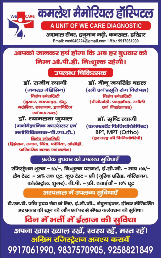 Haridwar News…इस अस्पताल में हर बुधवार को Free OPD|Call 9917061990 & 9837570905