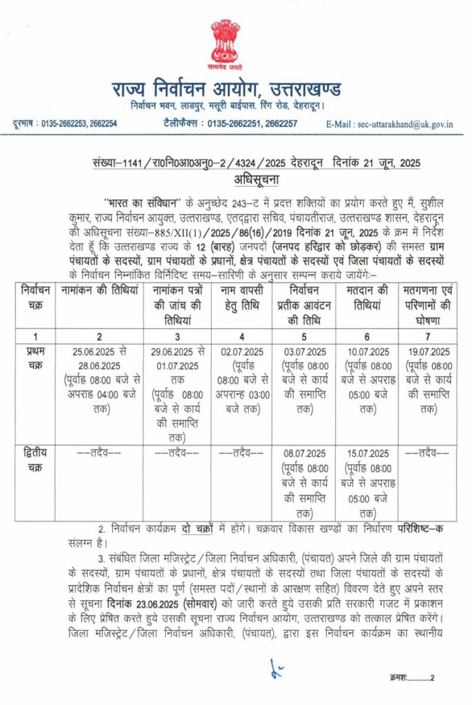 Uttarakhand Three Tier Panchayat Elections 2025 : देहरादून। उत्तराखंड में त्रिस्तरीय पंचायत चुनाव 2025 की अधिसूचना जारी हो गई है। राज्य निर्वाचन आयोग के अनुसार जनपद हरिद्वार को छोड़कर राज्य के अन्य 12 जिलों में दो चरणों में चुनाव कराए जाएंगे। इसके साथ ही प्रदेश के नगर क्षेत्र और हरिद्वार के अलावा अन्य सभी जगह आदर्श आचार संहिता लागू हो गई है, जो कि मतगणना तक प्रभावी रहेगी।