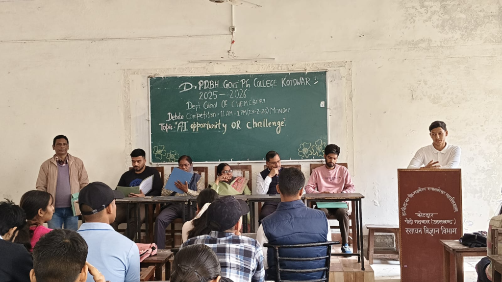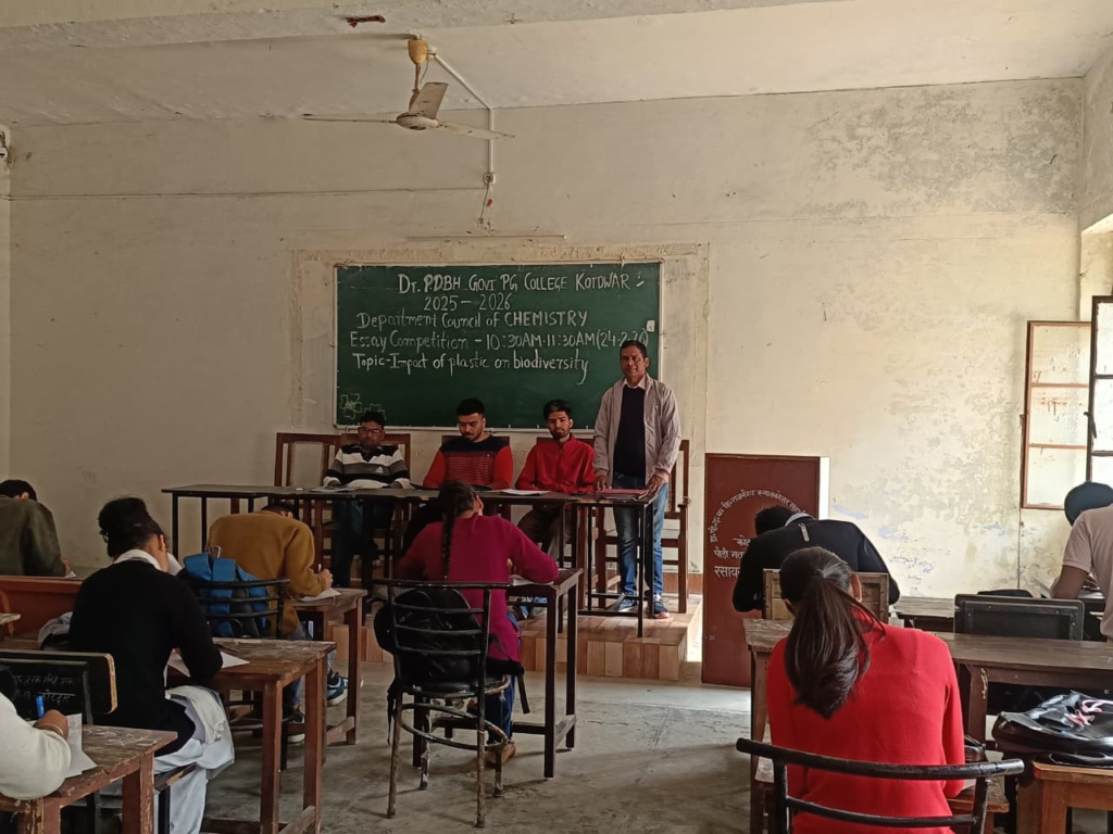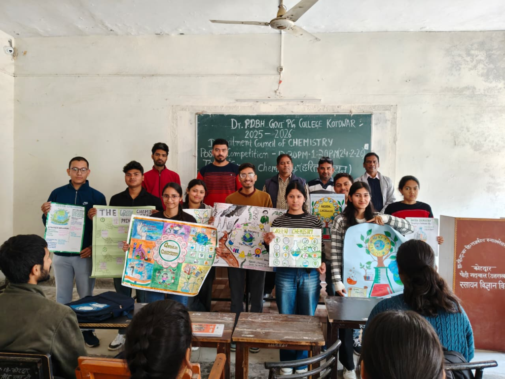 डॉ.पी.द. ब. हिमालयन राजकीय स्नातकोत्तर महाविद्यालय कोटद्वार के रसायन विज्ञान विभाग में रसायन विज्ञान विभागीय परिषद सत्र 2025 -26 के तत्वधान में दिनांक फरवरी 23 व 24 , 2026 को विभिन्न महत्वपूर्ण विषयों जैसे कृत्रिम बुद्धिमत्ता (ए आई) के अवसर या चुनौतियां, हरित रसायन (ग्रीन केमिस्ट्री), व जैव विविधता पर प्लास्टिक का प्रभाव आदि विषयों पर कई कार्यक्रम जैसे वाद-विवाद प्रतियोगिता , पोस्टर प्रतियोगिता, व निबंध प्रतियोगिता का आयोजन किया गया जिसमे रसायन विज्ञान विषय के स्नातक व स्नातकोत्तर कक्षाओं में अध्ययनरत लगभग 64 विद्यार्थियों ने प्रतिभाग किया।